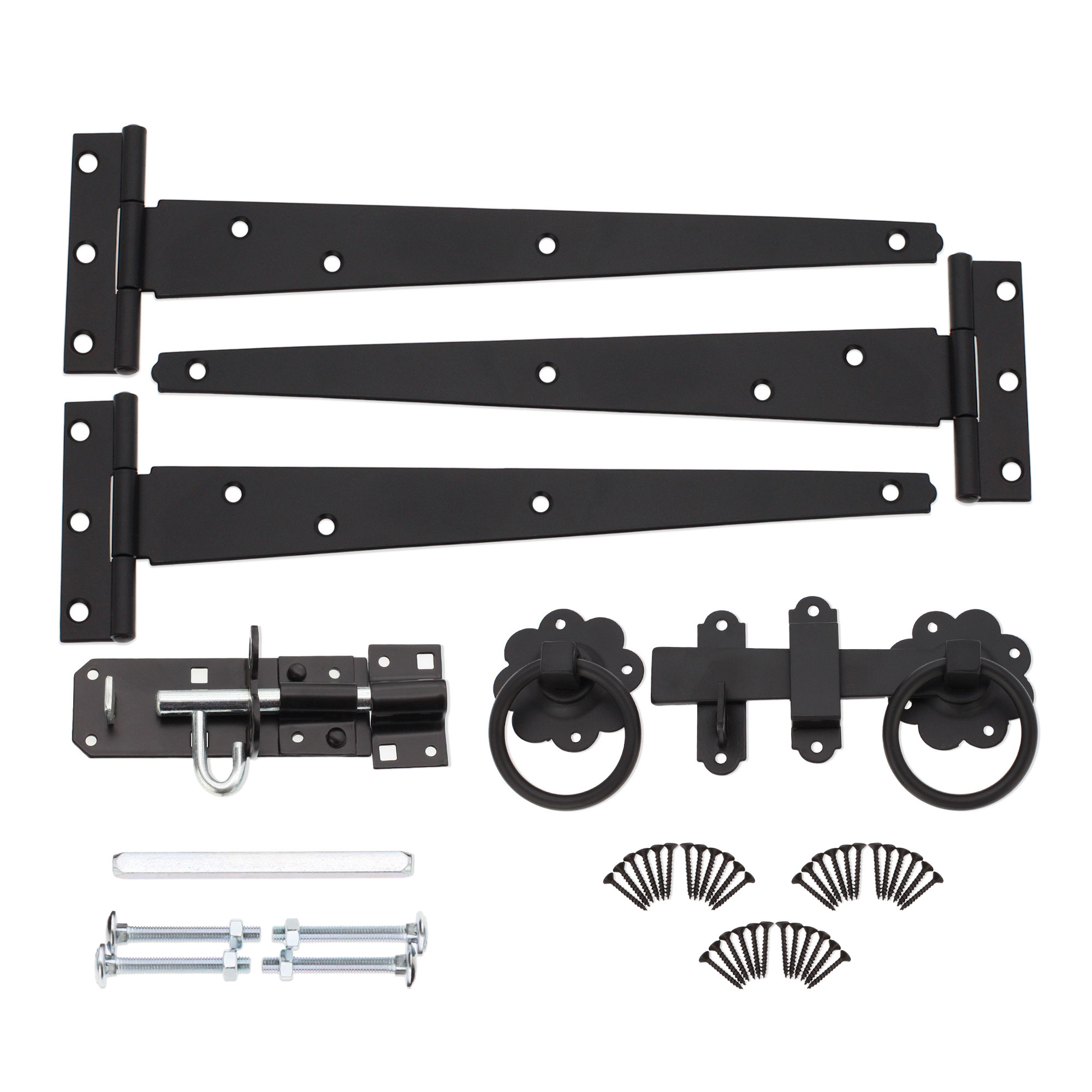 The Ironmongery Pack is the high-quality garden gate fitting kit comes with a standard 3 x T-Hinges with 1 x Brenton Bolt and 1 x Plain Ring Gate latch, all comes with matching fixing screws with black powder-coated for resistance to rust and corrosion. To be used externally or internally to securely close doors, garden gates and shed doors. Accessible from Both Sides of the Gates.