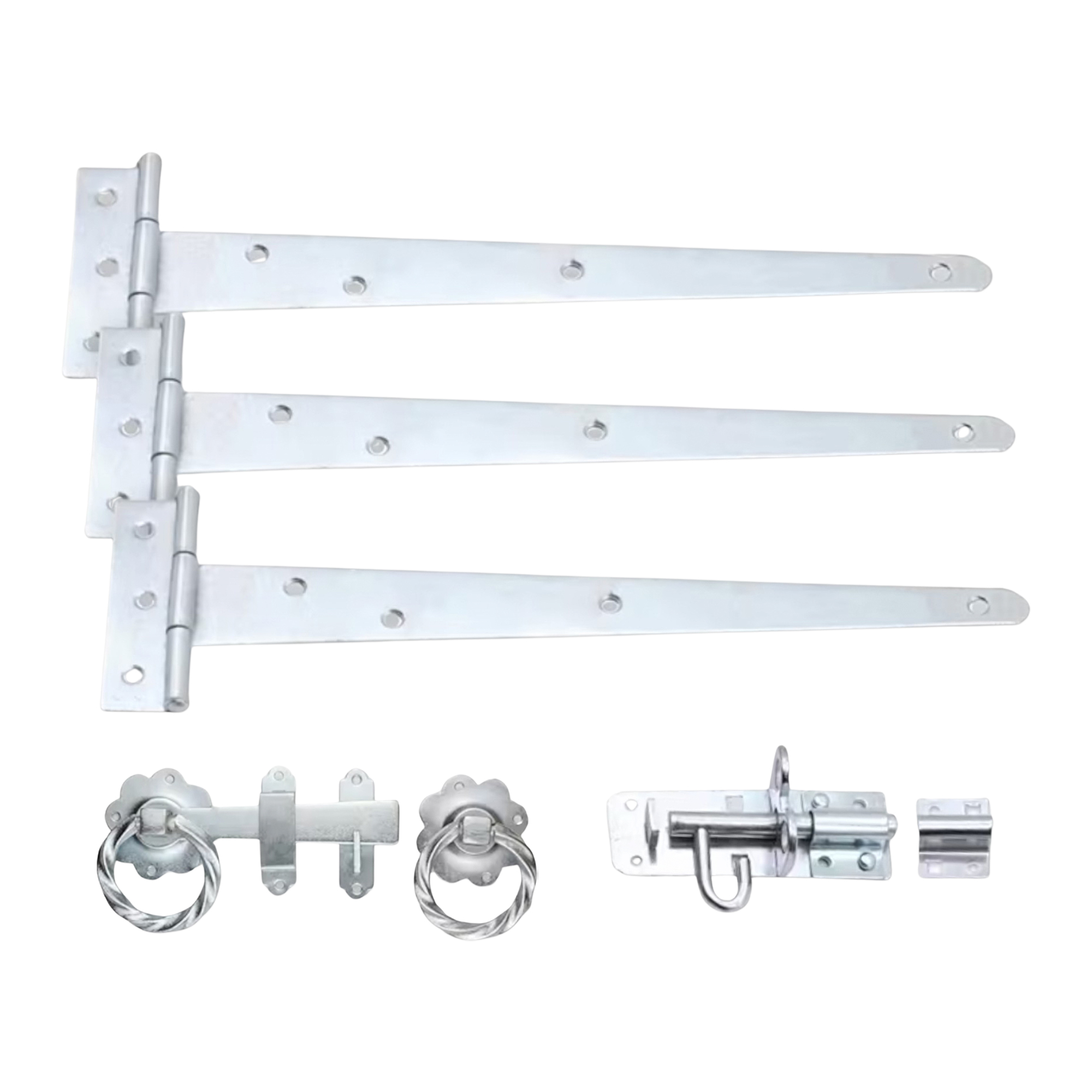 The Ironmongery Pack is the high-quality garden gate fitting kit comes with a standard 3 x T-Hinges with 1 x Brenton Bolt and 1 x Twisted Ring Gate latch, all comes with matching fixing screws with zinc-plated for resistance to rust and corrosion. To be used externally or internally to securely close doors, garden gates and shed doors. Accessible from Both Sides of the Gates.