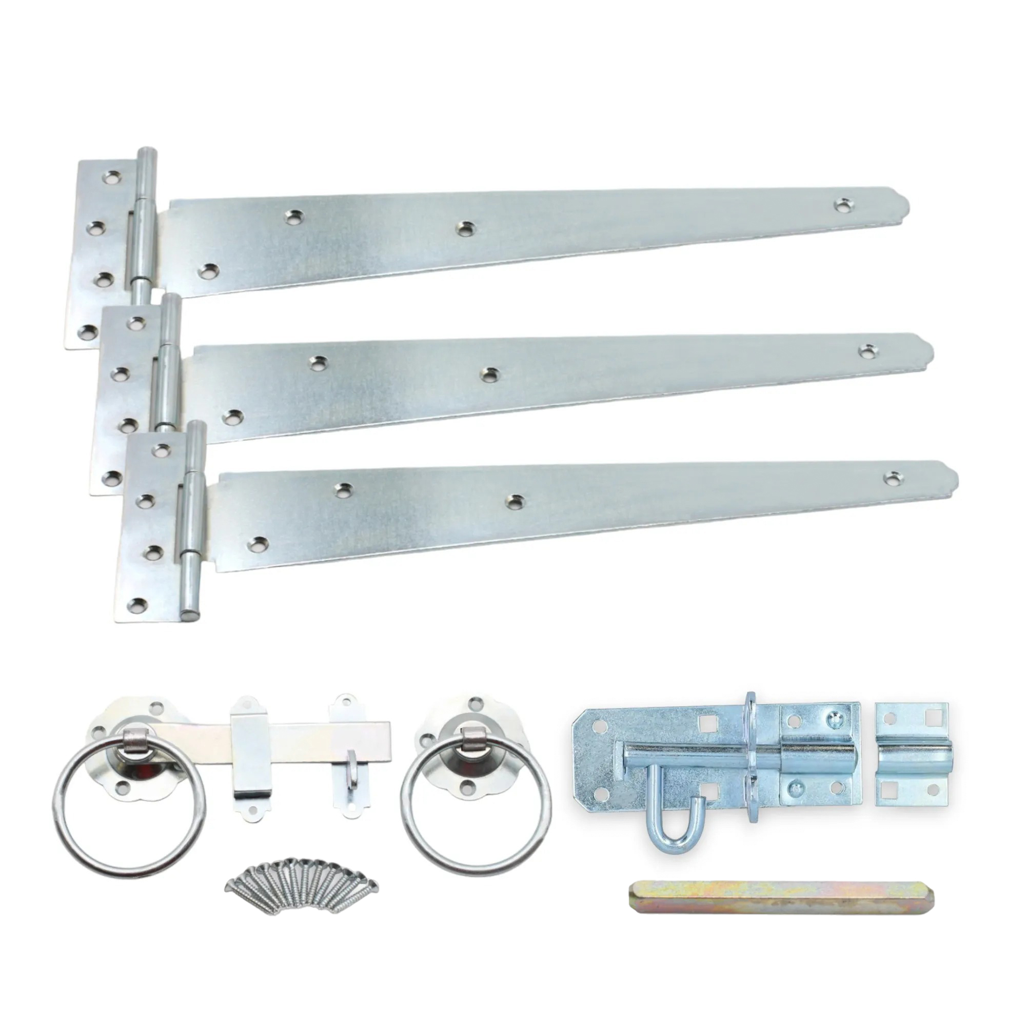 The Ironmongery Pack is the high-quality garden gate fitting kit comes with a standard 3 x T-Hinges with 1 x Brenton Bolt and 1 x Plain Ring Gate latch, all comes with matching fixing screws with zinc-plated for resistance to rust and corrosion. To be used externally or internally to securely close doors, garden gates and shed doors. Accessible from Both Sides of the Gates.