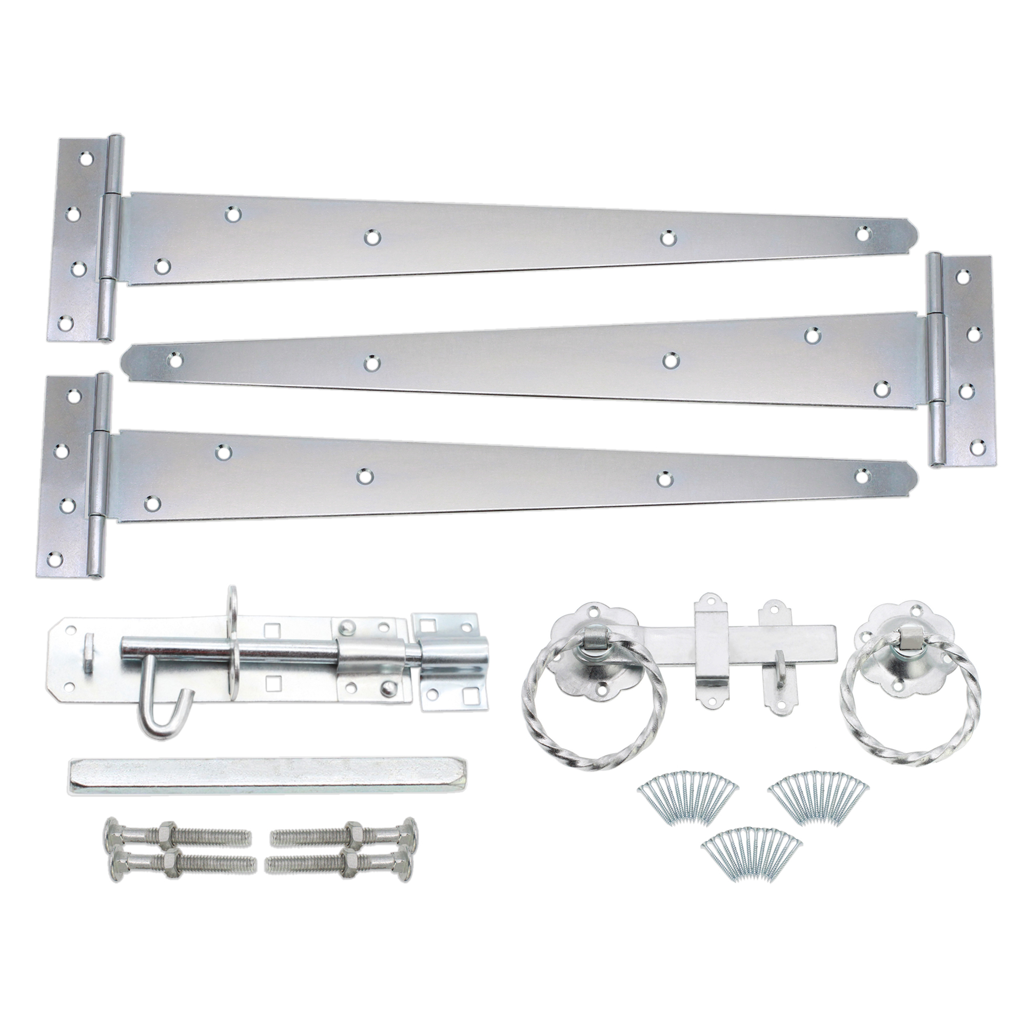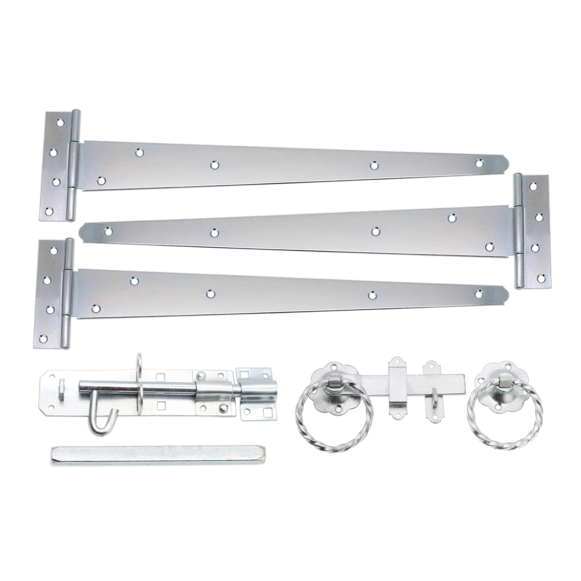 The Ironmongery Pack is the high-quality garden gate fitting kit comes with a standard 3 x T-Hinges with 1 x Brenton Bolt and 1 x Twisted Ring Gate latch, all comes with matching fixing screws with zinc-plated for resistance to rust and corrosion. To be used externally or internally to securely close doors, garden gates and shed doors. Accessible from Both Sides of the Gates.