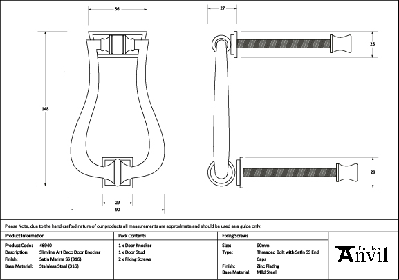 Our Art Deco door knocker is forged from grade 316 Marine Stainless Steel which highlights all the hand finished details of its design. A perfect choice for external doors, with many matching products available.