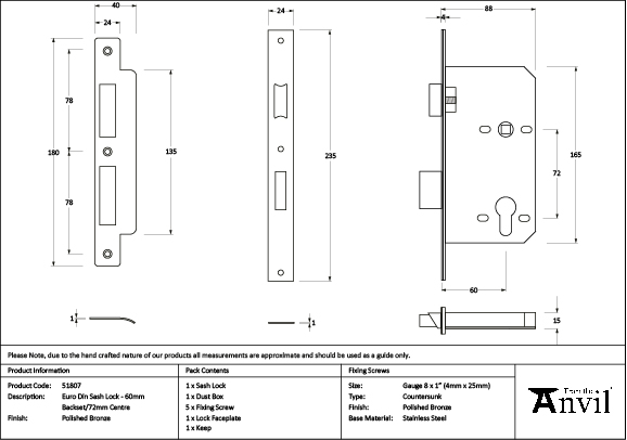 Polished Bronze Euro Din Sash Lock – 60mm Backset/72mm Centre | 51807