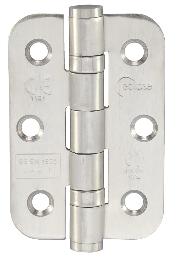 Eclipse Stainless Steel Bearing Hinge, Manufactured With 10mm Radius, Grade 7 (40 Kg Total Door Mass), SUS 201 Material Stainless Steel, CE 2812, UKCA 1121, Certifire CF336, BS EN1935 Performance Tested 200,000 Cycles To Grade 13, BS EN1634 Fire Tested FD30, 60 Minute Timber Door, 76x51x2mm, 8 Gauge Countersunk, Supplied With 8×1.1/4″ Pozi Drive Screws, Supplied As A Pack of 2