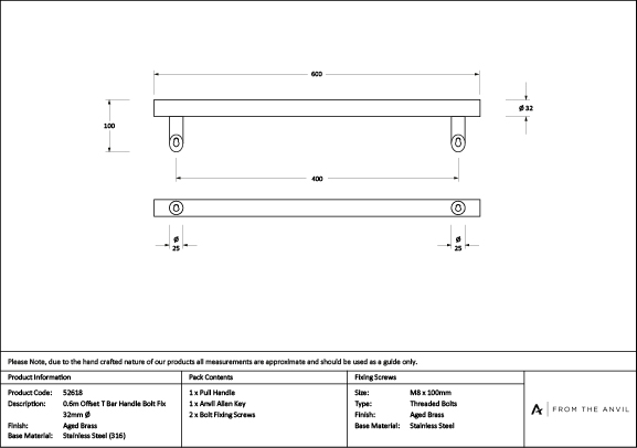Our stylish T-bar pull handles have a modern, simplistic design and are perfect for use on entrance doors. Manufactured from marine grade 316 stainless steel, these pull handles offer unrivalled corrosion resistance. This bolt fix option allows the pull handle to be bolted through from the inside of your door. Maximum door thickness: 80mm Available in five different sizes. Supplied with matching SS bolts. A popular choice for Period homes and interiors; Our Aged Brass finish offers a characterful warmth and works beautifully, creating a real statement when used with deep, dark paint colours, and materials & textiles synonymous with luxury and abundance. Manufactured from solid, unlacquered Brass, our Aged Brass products undergo an accelerated ageing process before surface areas are repolished, creating a striking contrast between the darker patina left around the edges and recesses, and brighter surface areas. As an unlacquered, ‘living’ finish Aged Brass will continue to oxidise, meaning it will darken over time. If the product becomes too dark or tarnished, it can be polished to restore the brighter finish on surface areas. Click to learn more about this Finish.