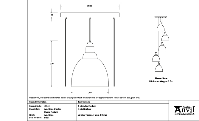 Our Brindley cluster pendants are as eye-catching as they are versatile, and look fantastic when paired with matching wall lights. Our cluster pendants are a real statement piece. Featuring five matching pendants hung at differing heights, they are perfect for high-ceilinged entrance hallways or dining rooms. All our cluster pendants are made to order with a three to four week lead time. Overall height (from top of ceiling rose to bottom of lowest pendant) 1.3m as standard, but pendant heights can be bespokely altered to your preference if needed. These light fittings are dimmable when fitted with a compatible dimmable LED bulb. Bulb: LED Only – 6W Maximum (purchased separately) Supplied fully wired with large ceiling rose and all necessary fixings. Our cluster pendants are available in a wide range of colours and finishes. We also offer a bespoke colour service – please contact us for further information. Our Aged Brass pendants offer a matt finish with a sense of quality. Spun from solid brass, these pendants are aged then carefully re-polished by hand to create a contemporary look with depth. When lit, the pendants provide a warming glow and look great when matched with Brass cabinet furniture. This finish is versatile and looks great against many paint colours.