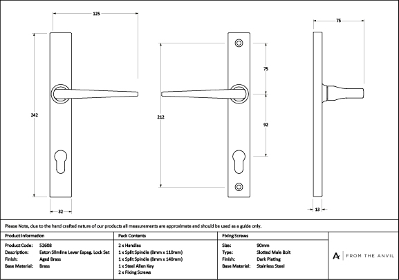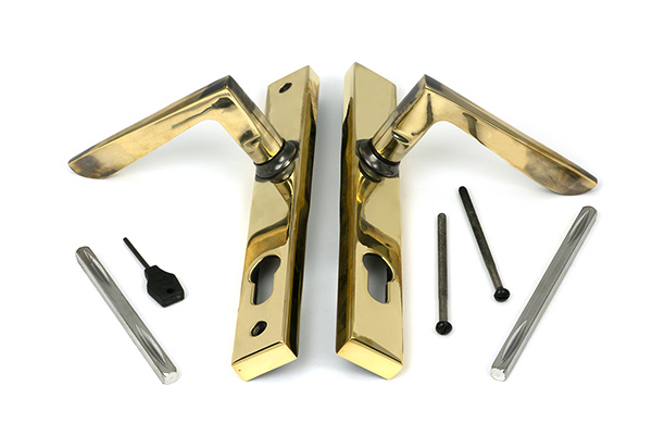 Eaton is a clean, angular design featuring a slim, tapered lever. Hand forged from solid brass this sleek, ergonomic lever handle is perfectly suited to modern properties and interior styles. The handle has a strong double spring incorporated into its stylish boss design which provides both elegance and practicality. Lever handle for external doors where multi-point locking systems are required. Set includes an internal and external lever espag lock handle. Suitable for use with a multi-point lock or French door kit in conjunction with a Euro cylinder. Supplied with SS bolt through fixings. A popular choice for Period homes and interiors; Our Aged Brass finish offers a characterful warmth and works beautifully, creating a real statement when used with deep, dark paint colours, and materials & textiles synonymous with luxury and abundance. Manufactured from solid, unlacquered Brass, our Aged Brass products undergo an accelerated ageing process before surface areas are repolished, creating a striking contrast between the darker patina left around the edges and recesses, and brighter surface areas. As an unlacquered, ‘living’ finish Aged Brass will continue to oxidise, meaning it will darken over time. If the product becomes too dark or tarnished, it can be polished to restore the brighter finish on surface areas. Click to learn more about this Finish.