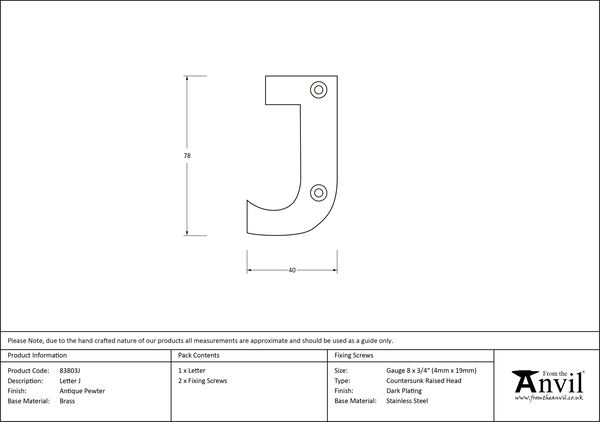 Our weighty, decorative letters will add the finishing touch to any entrance door. Sold in singles. Supplied with matching SS wood screws. Antique Pewter is a classic finish with industrial undertones and warmth; a slightly darker alternative to our Pewter Patina finish, but similarly versatile and well suited to a range of architectural styles and interiors thanks to its natural, understated notes. Our Antique Pewter finish is a soft, aged finish created through a multi step process on a solid brass base. First the products are plated, then a patina is applied before they and hand-rubbed, highlighting details in the metal and giving the products a vintage, timeworn look. Click to learn more about this Finish.