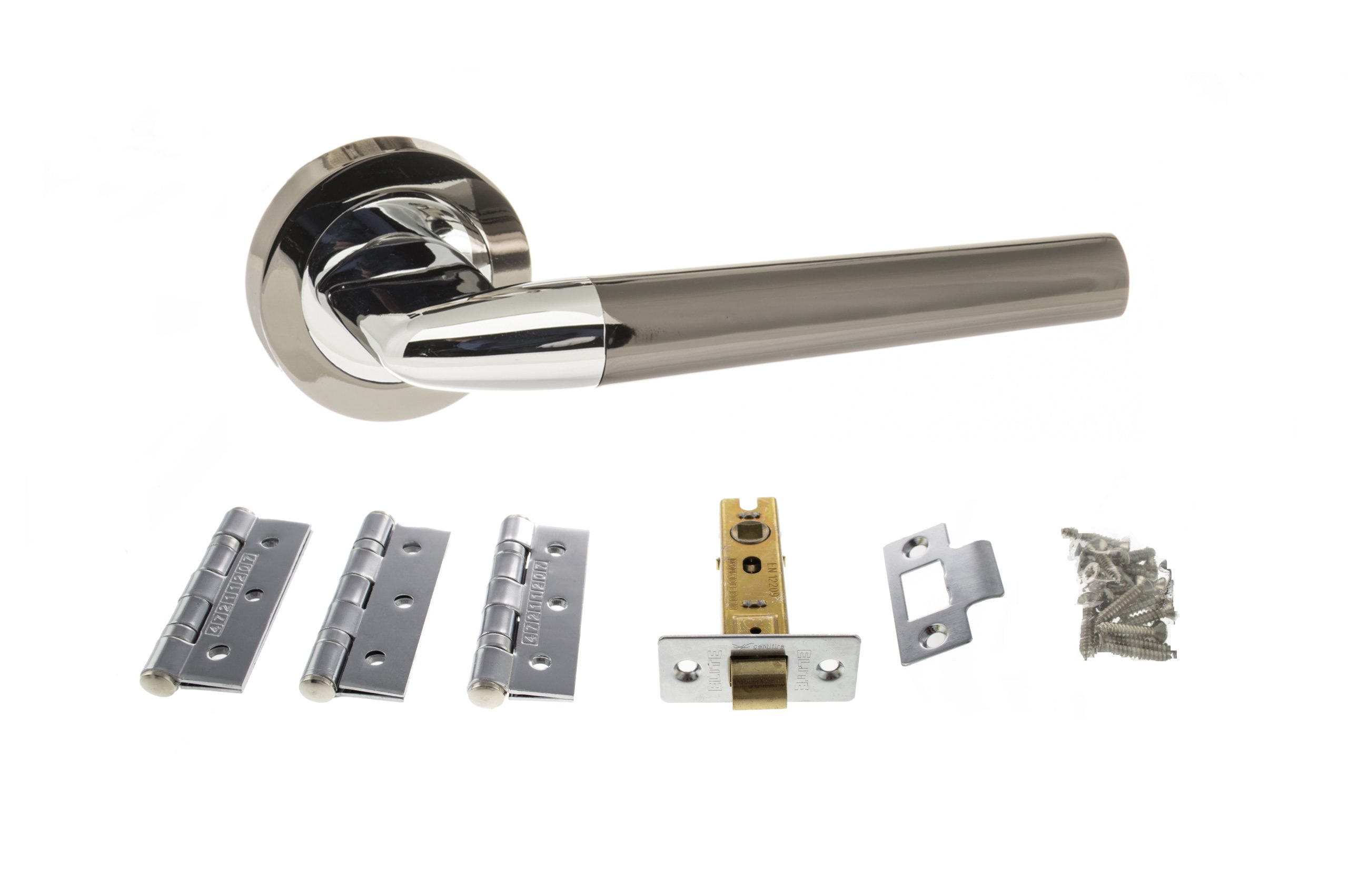 Upgrade your interior doors with the Black Nickel/Polished Chrome Latch Pack. This essential door hardware kit combines a smooth tubular latch with premium lever handles and hinges for a consistent, modern look throughout your home.