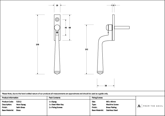 Our avon espagnolette fasteners suit both contemporary or traditional settings, offering all the benefits of a modern and secure configuration. Designed to fit any type of window, including uPVC and timber due to its slim fixing plate. Can be matched with the avon stays and door handles in the range. The handle is cranked forwards to ensure this protrudes far enough from the window for ease of use. The product is reversible so will work on both left and right handed windows They have a 7mm² x 40mm spindle and can be locked by way of a grub screw. Can be used with an espagnolette gearbox & window lock. Supplied with matching SS M5 screws. Satin Brass offers a sophisticated and more contemporary alternative to Polished and Aged Brass. The rich, warm undertones, and matt look of this finish exude luxury and are perfect for creating a statement in any space. Best suited to more modern homes and interiors, it works well when paired with darker tones and colours. Manufactured from solid brass, our Satin Brass products are brushed with a satin wheel during the final stages of manufacturing, giving them their distinctive, matt appearance, before a high quality matt lacquer is applied to the surface for protection. Click to learn more about this Finish.