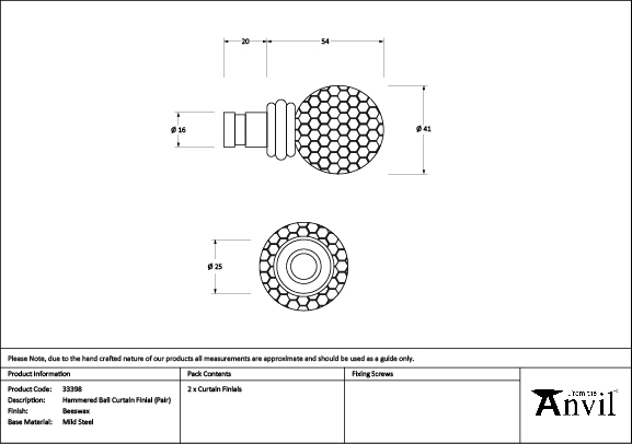 Our extensive collection of curtain furniture allows you to fully furnish your home with matching From The Anvil products, down to the finest details. These finials add a decorative finishing touch to our range of curtain poles. Our finials can also replace the standard end caps provided with our large pull handles, allowing coordination throughout your home. Sold in pairs. Beeswax is our most traditional finish with a soft, natural aesthetic featuring subtle blue and deep red ochre tones which are preserved in the steel during the manufacturing process; this finish is ideally suited to older, traditional dwellings and cottage interiors. Beeswax products are hand forged from mild steel. After forging, the subtle colours in the metal are preserved by dipping the products in hot beeswax, resulting in the soft, matte richness and offers excellent protection when the products are fitted internally. Click to learn more about this Finish.