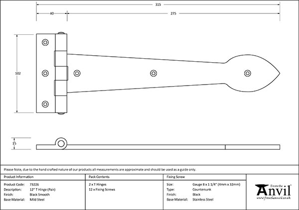 Black Smooth 16" Cast T Hinge (pair) | 73227 £34.25 ex. VAT | £41.10 inc. VAT
