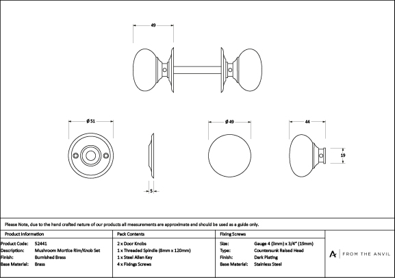 Burnished Brass 49mm Mushroom Mortice/Rim Knob Set | 52441