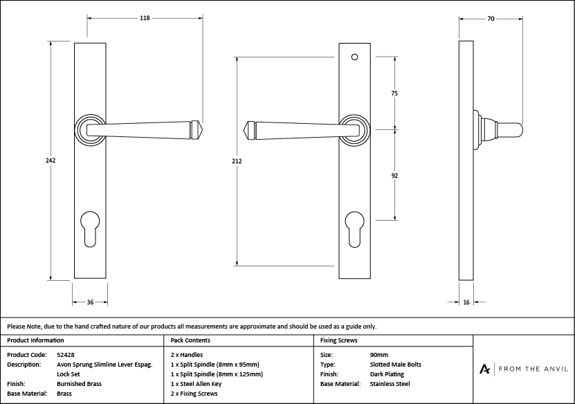 Our Avon lever handles are From The Anvil’s signature design and are loved for their timeless simplicity. Each lever is hand-hammered into shape by our expert Blacksmiths to give it a contemporary, yet individual, edge. Designed to match the products in our Avon range. This handle has a strong double spring incorporated into its stylish boss design which provides both elegance and practicality. Lever handle for external doors where multi-point locking is required. Set includes an internal and external lever espag lock handle. Suitable for use with a multi-point lock or French door kit in conjunction with a Euro cylinder. Supplied with matching SS bolt through fixings. Burnished Brass is an excellent choice for those wanting to add subtle luxury to their home interiors. Offering warmth without over dominating, this timeless finish complements a range of colours, and looks especially stunning when paired with paler shades. Hand forged from a base of solid brass, Burnished Brass is an excellent example of how our unique manufacturing techniques add further intrigue to the natural charm of the base material. Each product undergoes an accelerated ageing process, creating a dark patina before being placed into barrelling machines, giving them the beautiful burnished finish. During the final stages of manufacturing, a high quality, clear matt lacquer is applied for protection. Click to learn more about this Finish.