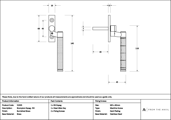 The contemporary Brompton suite features a textured, knurled surface. The industrial styling of the diamond pattern creates a modern range of products that can be used consistently throughout a property. Our Brompton window furniture is hand forged from solid brass to create a product that’s as beautiful as it is hardwearing. A perfect design choice to use throughout your property with many matching products available. Due to their slim fixing plates, our espagnolettes can be fitted on any type of window including uPVC and timber. Designed to match the products in our Brompton range. The product is handed and therefore care needs to be taken when choosing the correct hand. From the inside view, if your window is hinged on the left then a left-hand fastener is required. They have a 7mm² x 40mm spindle and can be locked by way of a grub screw. Suitable for use with an espagnolette gearbox and window lock. Supplied with matching SS M5 screws. Burnished Brass is an excellent choice for those wanting to add subtle luxury to their home interiors. Offering warmth without over dominating, this timeless finish complements a range of colours, and looks especially stunning when paired with paler shades. Hand forged from a base of solid brass, Burnished Brass is an excellent example of how our unique manufacturing techniques add further intrigue to the natural charm of the base material. Each product undergoes an accelerated ageing process, creating a dark patina before being placed into barrelling machines, giving them the beautiful burnished finish. During the final stages of manufacturing, a high quality, clear matt lacquer is applied for protection. Click to learn more about this Finish.