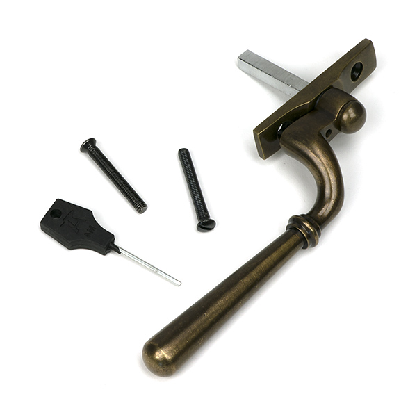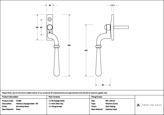 The Newbury range is sleek and elegant, with a slender design that suits a variety of property types. Our weighty range of Newbury window furniture is hand forged from solid brass to create a product that’s as beautiful as it is hardwearing. A perfect design choice to use throughout your property with many matching products available. Due to their slim fixing plates, our espagnolettes can be fitted on any type of window including uPVC and timber. Designed to match the products in our Newbury range. The product is handed and therefore care needs to be taken when choosing the correct hand. From the inside view, if your window is hinged on the right then a right-hand fastener is required. They have a 7mm² x 40mm spindle and can be locked by way of a grub screw. Suitable for use with an espagnolette gearbox and window lock. Supplied with matching SS M5 screws. Burnished Brass is an excellent choice for those wanting to add subtle luxury to their home interiors. Offering warmth without over dominating, this timeless finish complements a range of colours, and looks especially stunning when paired with paler shades. Hand forged from a base of solid brass, Burnished Brass is an excellent example of how our unique manufacturing techniques add further intrigue to the natural charm of the base material. Each product undergoes an accelerated ageing process, creating a dark patina before being placed into barrelling machines, giving them the beautiful burnished finish. During the final stages of manufacturing, a high quality, clear matt lacquer is applied for protection. Click to learn more about this Finish.