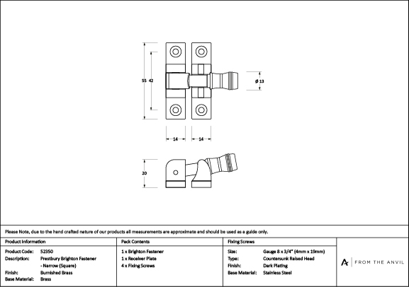 Burnished Brass Prestbury Brighton Fastener – Narrow (Square) | 52350