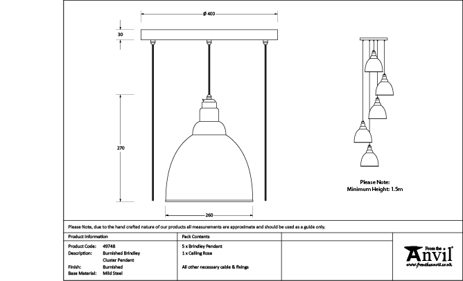 Our Brindley cluster pendants are as eye-catching as they are versatile, and look fantastic when paired with matching wall lights. Our cluster pendants are a real statement piece. Featuring five matching pendants hung at differing heights, they are perfect for high-ceilinged entrance hallways or dining rooms. All our cluster pendants are made to order with a three to four week lead time. Overall height (from top of ceiling rose to bottom of lowest pendant) 1.3m as standard, pendant heights can be bespokely altered to your preference if needed. Our light fittings are dimmable when fitted with a compatible dimmable LED bulb. Bulb: LED Only – 6W Maximum (purchased separately) Supplied fully wired with large ceiling rose and all necessary fixings. Our cluster pendants are available in a wide range of colours and finishes. We also offer a bespoke colour service – please contact us for further information. Our exclusive burnishing technique reveals beautiful layers of colour and texture within the metal, which creates a translucent feel when lit. Each pendant is burnished by hand to make every shade unique. Please note that this finishing process means that the colours and pattern may vary slightly from the images displayed.