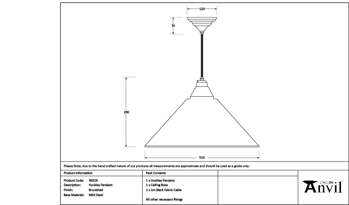 Our Hockley pendants have a sleek silhouette that brings drama to any space. They look fantastic individually, or can be combined to create further interest. All our pendants are made to order with a three to four week lead time. Our light fittings are dimmable when fitted with a compatible dimmable LED bulb. Supplied fully wired with matching ceiling rose and all necessary fixings. 1m of black fabric cable provided as standard. Bulb: LED Only – 6W Maximum (purchased separately) Our pendants are available in a wide range of colours and finishes. We also offer a bespoke colour service – please contact us for further information. Our exclusive burnishing technique reveals beautiful layers of colour and texture within the metal, which creates a translucent feel when lit. Each pendant is burnished by hand to make every shade unique. Please note that this finishing process means that the colours and pattern may vary slightly from the images displayed.