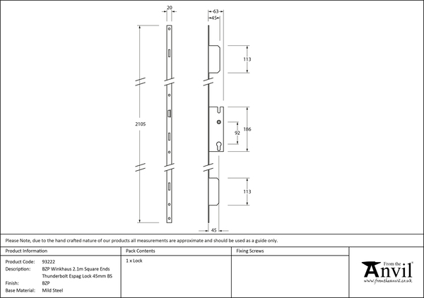 For use with our 92mm centre espagnolette locking handle sets. Solid twin deadbolts in the upper and lower positions. 50% greater fitting tolerances compared to conventional hook locking systems. Suitable for shorter doors, min/max door height: 1625mm/2105mm Please note 1 x Euro cylinder needs to be purchased separately. BZP, or Bright Zinc Plated, products are made from steel and plated with a thin layer of zinc using an electric current, to protect against rusting and oxidisation.