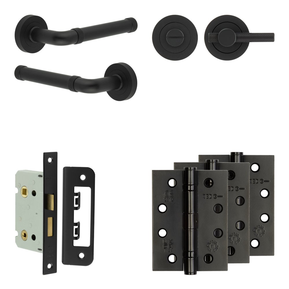1 x pair of Midtown lever handles on rose1 × Jedo Kontrax 65mm bathroom lock (Square forend / Radiused strike plate)1 × turn & release or thumbturn & release (selectable)3 × door hinges (4 inch)Fixings and spindle