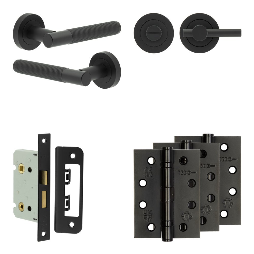 1 x pair of Venice lever handles on rose1 × Jedo Kontrax 65mm bathroom lock (Square forend / Radiused strike plate)1 × turn & release or thumbturn & release (selectable)3 × door hinges (4 inch)Fixings and spindle