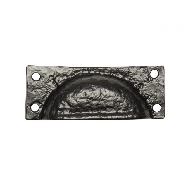 The Kirkpatrick 1549 Drawer Pull is a traditional, hand-finished rustic cup handle made from antique black malleable iron in the UK.