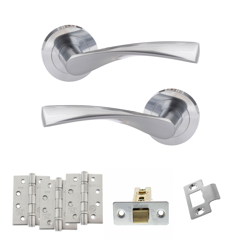 Eco Aqua Door Handle Pack (Latch Set – 2.5″ CE Latch, 3″ Fire Rated Hinges x3) – Satin Chrome