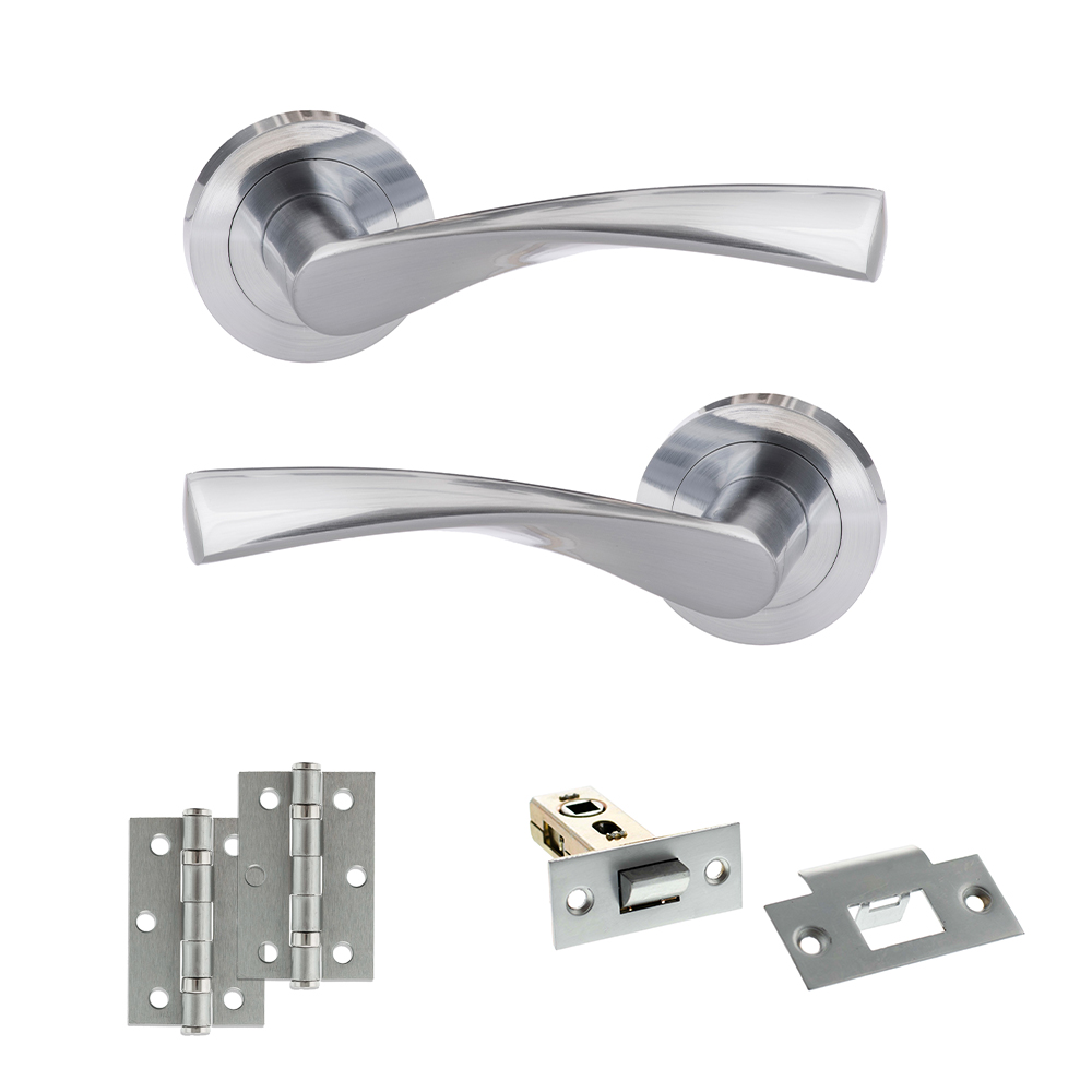 Eco Aqua Door Handle Pack (Latch Set – 2.5″ CE Latch, 3″ Fire Rated Hinges x3) – Satin Chrome