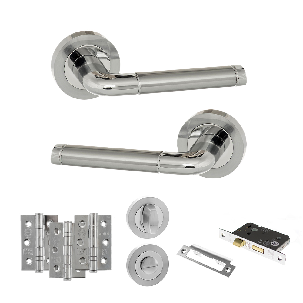 Eco Swell Door Handle Pack (Bathroom Set – 2.5″ CE Bathroom Lock, 4″ Fire Rated Hinges x3) – Satin Chrome/Polished Chrome