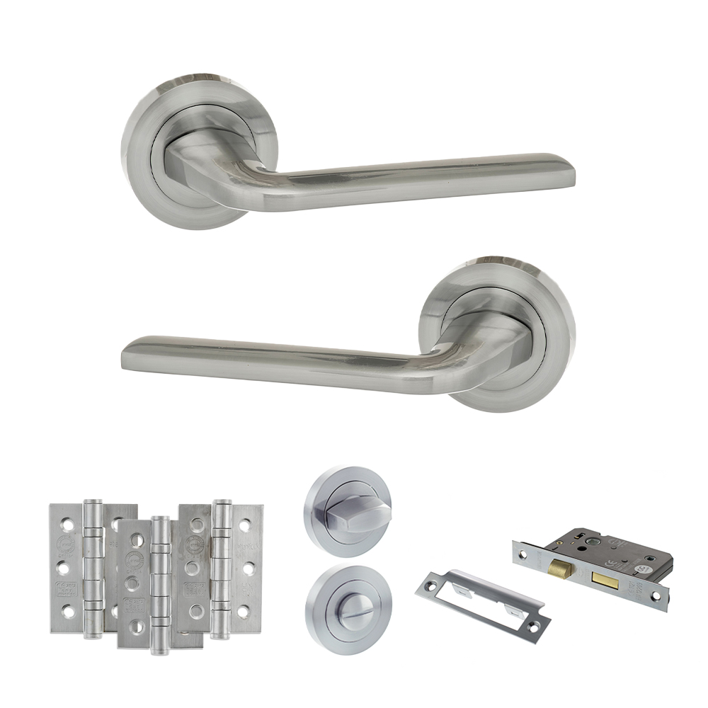 Eco Aqua Door Handle Pack (Bathroom Set – 2.5″ CE Bathroom Lock, 4″ Fire Rated Hinges x3) – Satin Chrome
