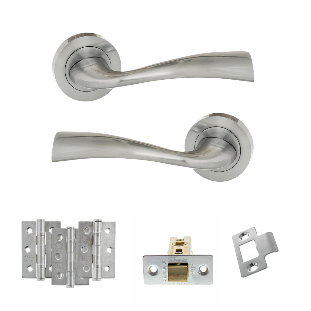 Eco Wave Door Handle Pack (Latch Set – 2.5″ CE Latch, 3″ Fire Rated Hinges x3) – Satin Chrome