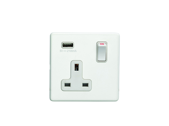 1 Gang 13Amp Dp Switched Socket With 2.1 Amp Usb Outlet Flat Concealed White Plate White Rocker