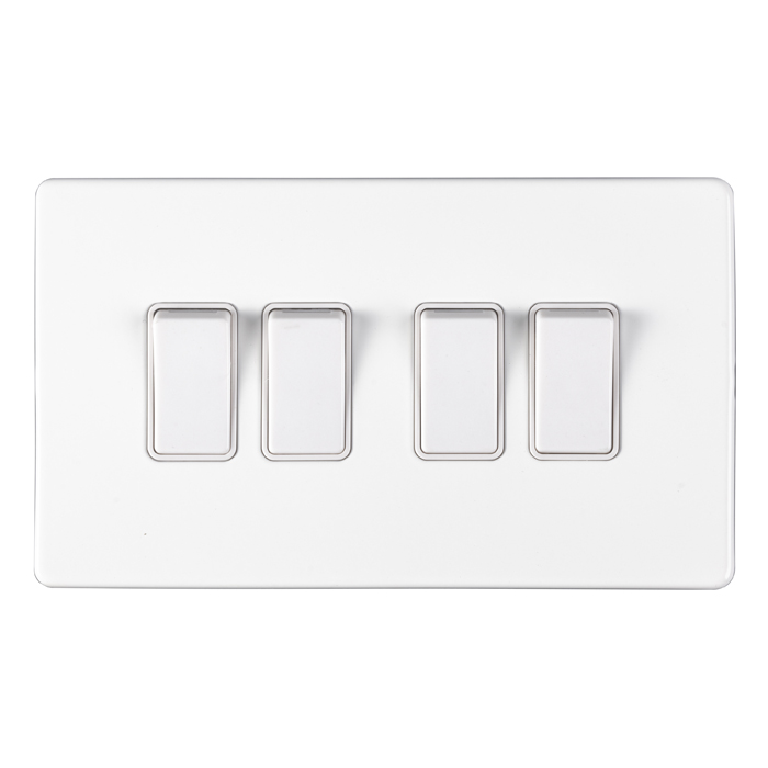 4 Gang 10Amp 2Way Switch Flat Concealed White Plate White Rockers
