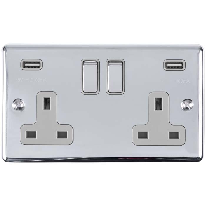 2 GANG 13AMP SWITCHED SOCKET WITH COMB 3.1 AMP USB OUTLETS POLISHED CHROME ENHANCE RANGE GREY TRIM