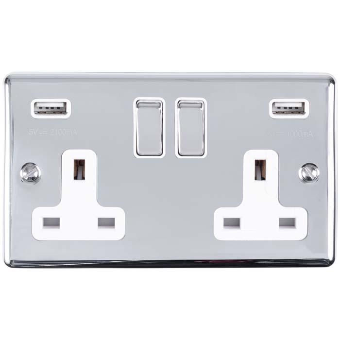 2 Gang 13Amp Switched Socket With Comb 3.1 Amp Usb Outlets Polished Chrome Enhance Range White Trim