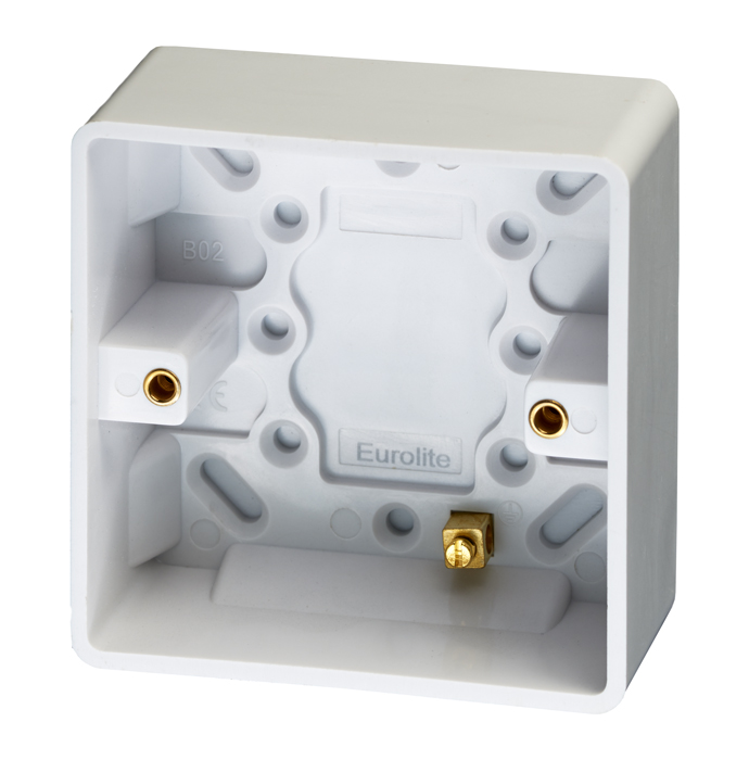 Enhance White Plastic 47mm Deep Single Pattress Box With 1 cable clamp position and brass earth terminal