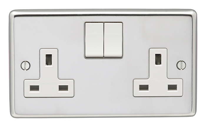 2 Gang 13Amp DP Switched Socket Round Edge Polished Stainless Steel Plate White Rockers