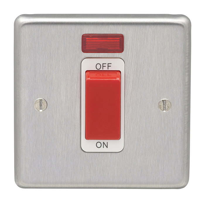 45Amp DP Cooker Switch With Neon Single Round Edge Satin Stainless Steel Plate Red Rocker White Trim