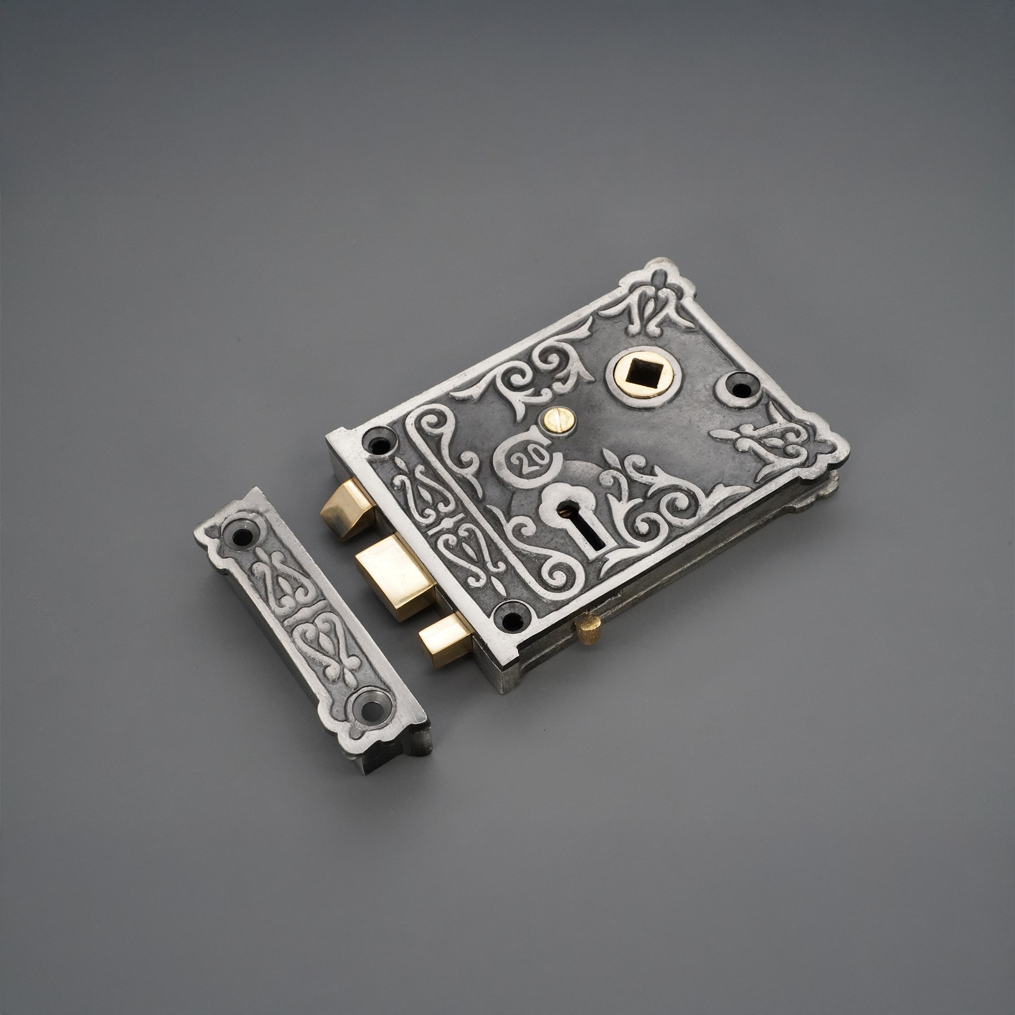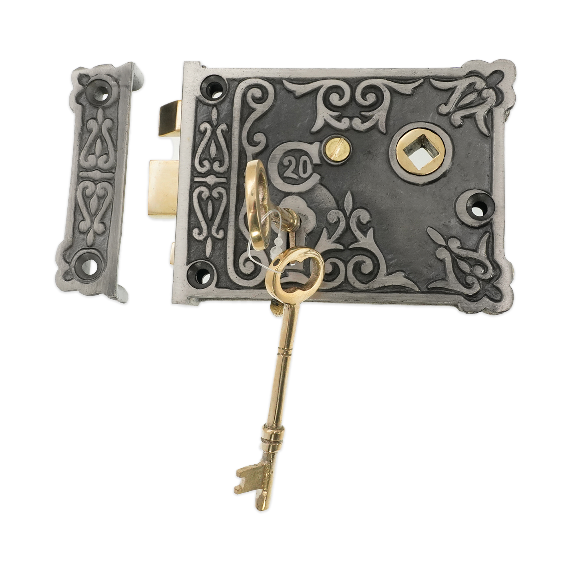 Our single lever, dual-handed solid cast ‘Floral’ iron rim lock with the attractive victorian floral pattern on lock is hand finished and is supplied with two solid brass keys and lock keep. It has a single lever mortise with four way key entry. Can be fitted to the left or right hand side of a door.