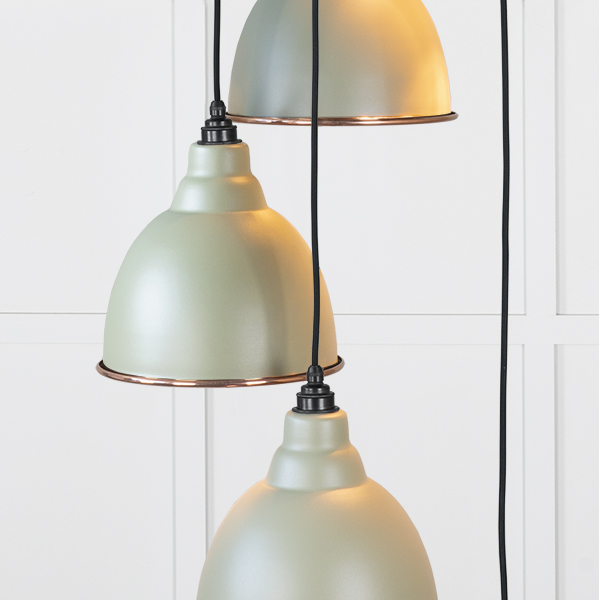 Our Brindley cluster pendants are as eye-catching as they are versatile, and look fantastic when paired with matching wall lights. Our cluster pendants are a real statement piece. Featuring five matching pendants hung at differing heights, they are perfect for high-ceilinged entrace hallways or dining rooms. All our cluster pendants are made to order with a three to four week lead time. Overall height (from top of ceiling rose to bottom of lowest pendant) 1.3m as standard, pendant heights can be bespokely altered to your preference if needed. Our light fittings are dimmable when fitted with a compatible dimmable LED bulb. Bulb: LED Only – 6W Maximum (purchased separately) Supplied fully wired with large ceiling rose and all necessary fixings. Our cluster pendants are available in a wide range of colours and finishes. We also offer a bespoke colour service – please contact us for further information. Our Hammered Copper pendants are spun from solid copper. When lit, this finish creates a soft, dappled light with a warm glow, best balanced with a cooler/brighter bulb.