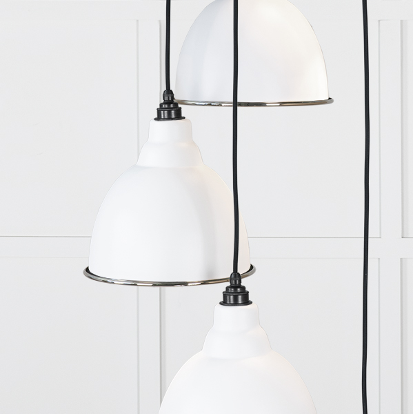 Our Brindley cluster pendants are as eye-catching as they are versatile, and look fantastic when paired with matching wall lights. Our cluster pendants are a real statement piece. Featuring five matching pendants hung at differing heights, they are perfect for high-ceilinged entrance hallways or dining rooms. All our cluster pendants are made to order with a three to four week lead time. Overall height (from top of ceiling rose to bottom of lowest pendant) 1.3m as standard, pendant heights can be bespokely altered to your preference if needed. Our light fittings are dimmable when fitted with a compatible dimmable LED bulb. Bulb: LED Only – 6W Maximum (purchased separately) Supplied fully wired with large ceiling rose and all necessary fixings. Our cluster pendants are available in a wide range of colours and finishes. We also offer a bespoke colour service – please contact us for further information. Our Hammered Nickel pendants are spun from solid brass and plated in nickel. When lit, the hammered interior glistens whilst emitting a soft, dappled light.