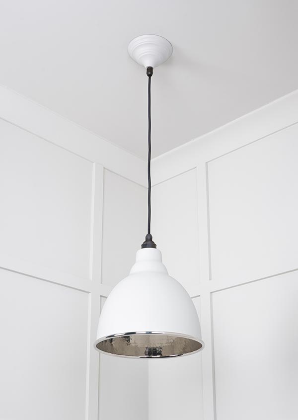 The Brindley pendant is versatile. It can be hung at different levels to brighten certain areas within a room and looks great in a group. Our pendants are all made to order on a 3-4 week lead time. Light fittings are dimmable as long as a dimmable LED bulb is fitted. Supplied fully wired with matching ceiling rose and all necessary fixings. 1m of black fabric cable as standard. Bulb: LED Only – 6W Maximum (purchased separately) Our pendants are available in a wide choice of finishes and colours. We also offer bespoke colours. Please contact us for further information. Our Hammered Nickel pendants are spun from solid brass and plated in nickel. When lit, the hammered interior glistens whilst emitting a soft, dappled light.