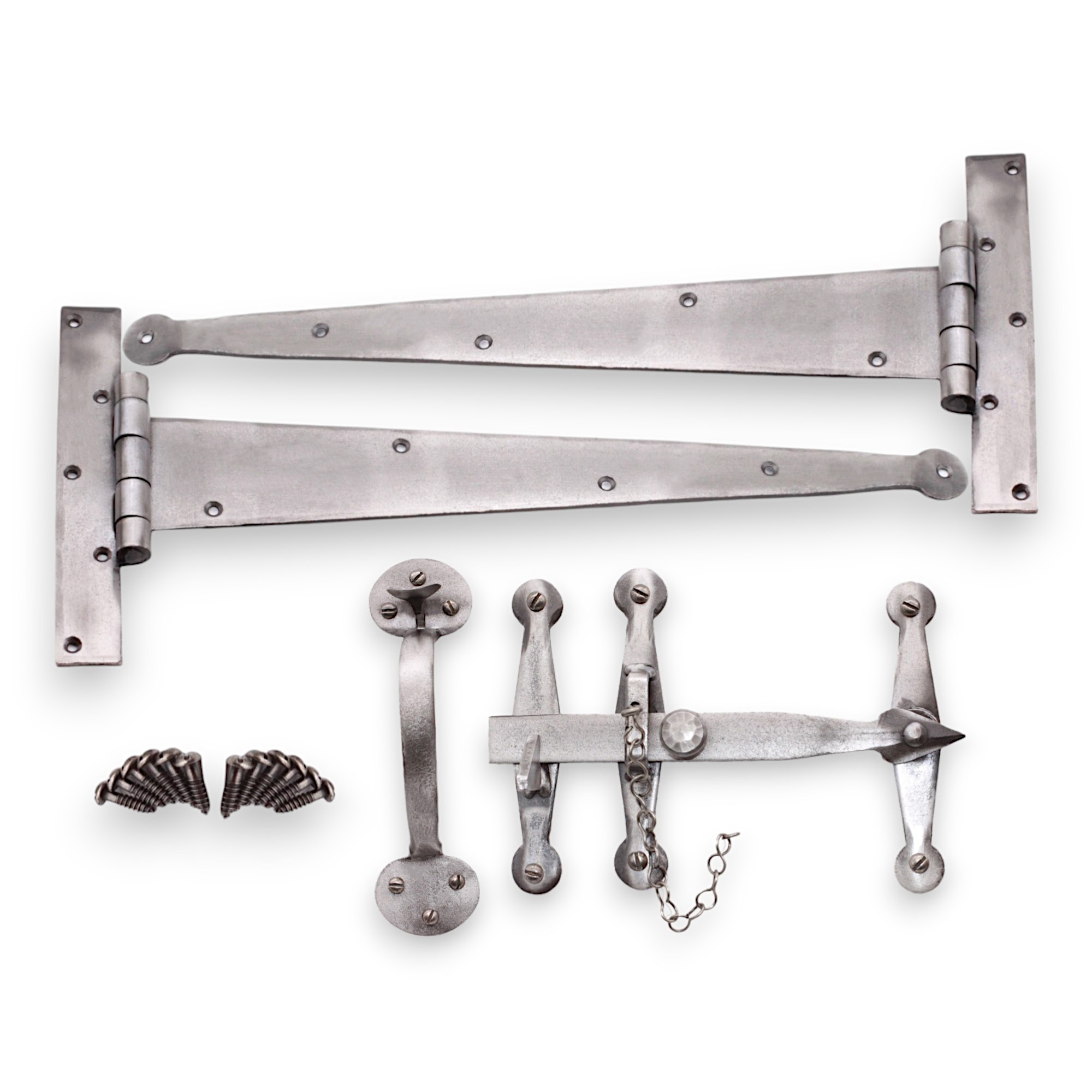 Our hand-made traditional ‘Heavy Duty Handforged Kit’ is made of solid construction to suit any range of solid oak ledged doors. Each kit comes with matching screws to make for an easy installation and with 2 x 440mm steel strap hinges with penny end detail, and one thumb latch set with locking pin. When installing onto an oak door, we find that it is necessary to pilot hole the door before fixing with the provided screws. The two finish options are a hand applied beeswax over an antiqued metal base and pewter both look superb as it matches in with rustic oak doors.