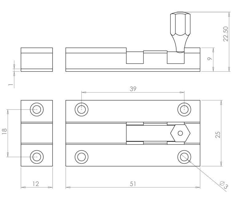 • Like other straight barrel bolts, a brass straight barrel bolt consists of a cylindrical metal rod (the barrel) that slides horizontally within a housing or brackets mounted on one surface. When extended, the bolt engages with a hole, slot, or strike plate on the adjacent surface to lock the two surfaces together. TECHNICAL DRAWING.