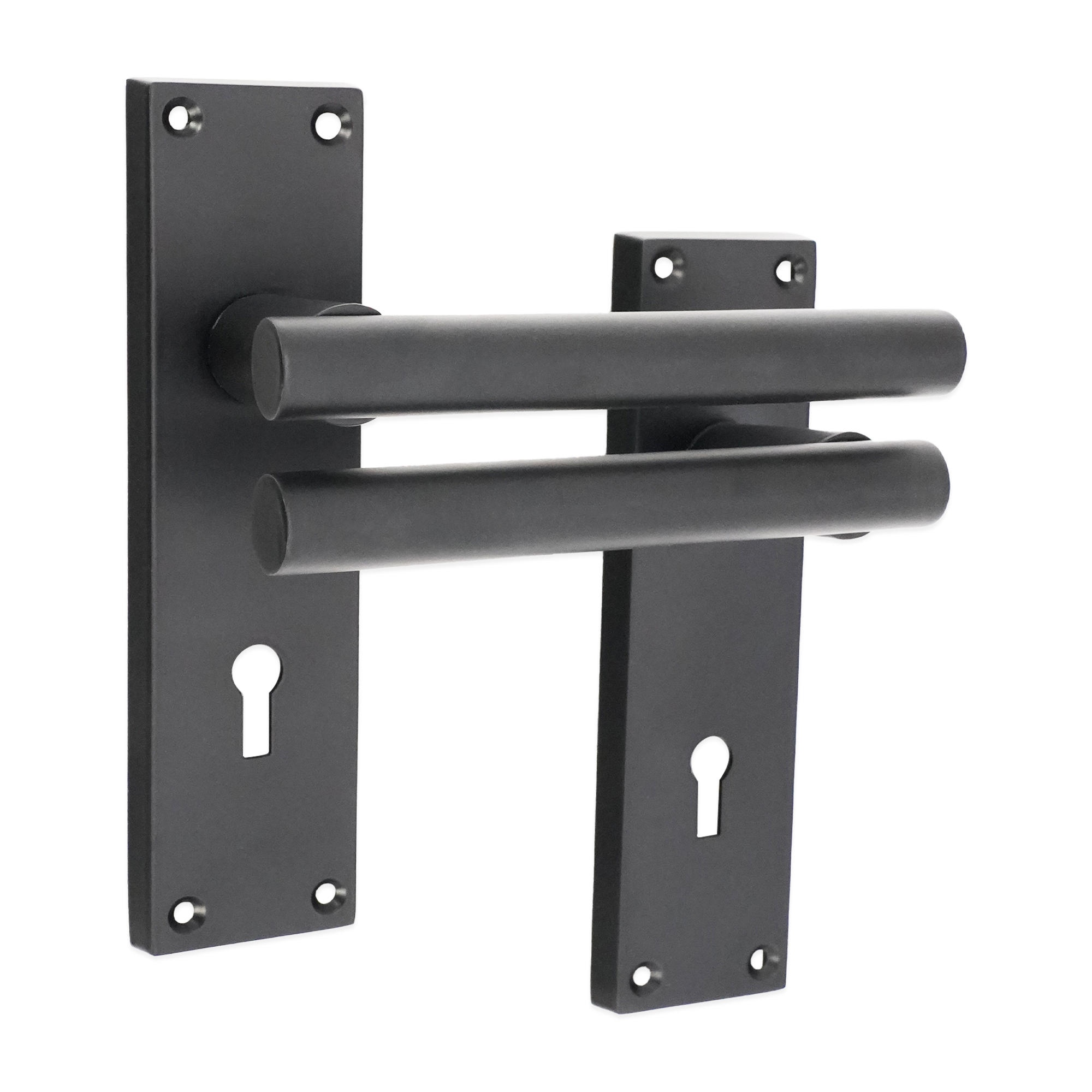 Our modern style “Jura” lever on backplate door handles with standard keyhole profile offer a timeless design, featuring a comfortable square head with straight t bar lever for interior and exterior doors where you have decided to use lock type handles on backplate.
