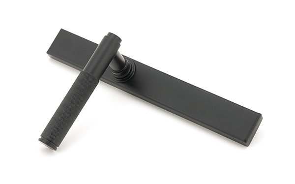 The contemporary Brompton suite features a textured, knurled surface. The industrial styling of the diamond effect creates a modern range of products that can be used throughout your property. Our Brompton lever handle range is forged from mild steel which emphasises the high quality materials and manufacturing techniques used. A perfect design choice to use throughout your property with many matching products available. This handle has a strong double spring incorporated into the stylish boss design to give both functionality & elegance. Lever handle for external doors where multi-point locking is required. Set includes an internal and external lever espag latch handle. Suitable for use with a French door kit in conjunction with a slimline lever espag. lock set and Euro cylinder. Supplied with matching SS bolt through fixings. Matt Black is an extremely versatile, timeless finish; Naturally, it looks great when used in ultra-modern settings, but can also be used to add a touch of sophistication and refinement to more traditional homes and interiors. Our Matt Black finish is applied to a base of solid steel, before being baked in a high temperature oven, resulting in the unique, subtle black patina which emphasises the products clean silhouette. An extremely low maintenance finish, ideal for use in kitchens and bathrooms, or externally where damp conditions are expected. Click to learn more about this Finish.