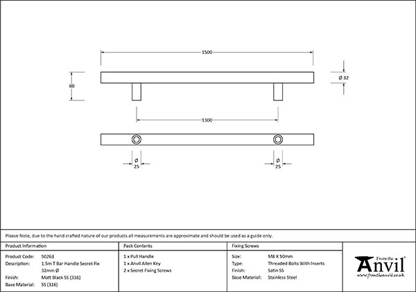 Matt Black SS (316) 1.5m T Bar Handle Secret Fix 32mm Ø | 50263