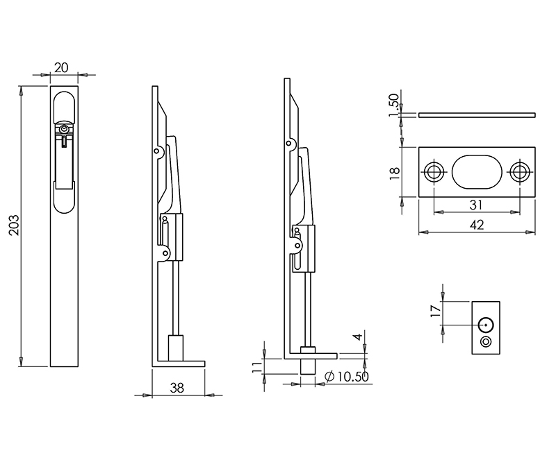 • Flush Bolts provide a sleek and unobtrusive solution for securing the inactive leaf of double doors, perfect for maintaining a clean aesthetic in modern interiors.