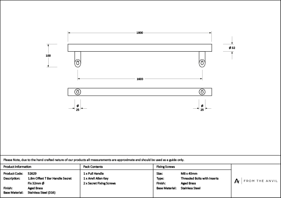 Aged Brass (316) 1.8m Offset T Bar Handle Secret Fix 32mm Ø | 52629