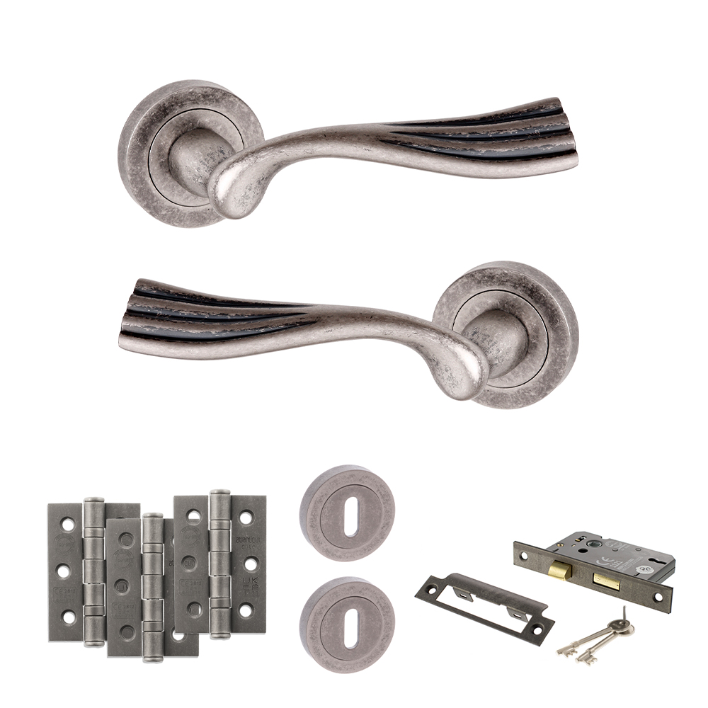 Old English Richmond Door Handle Pack (3 Lever Lock Set – 3″ CE Sashlock, 3″ Fire Rated Hinges x3) – Distressed Silver